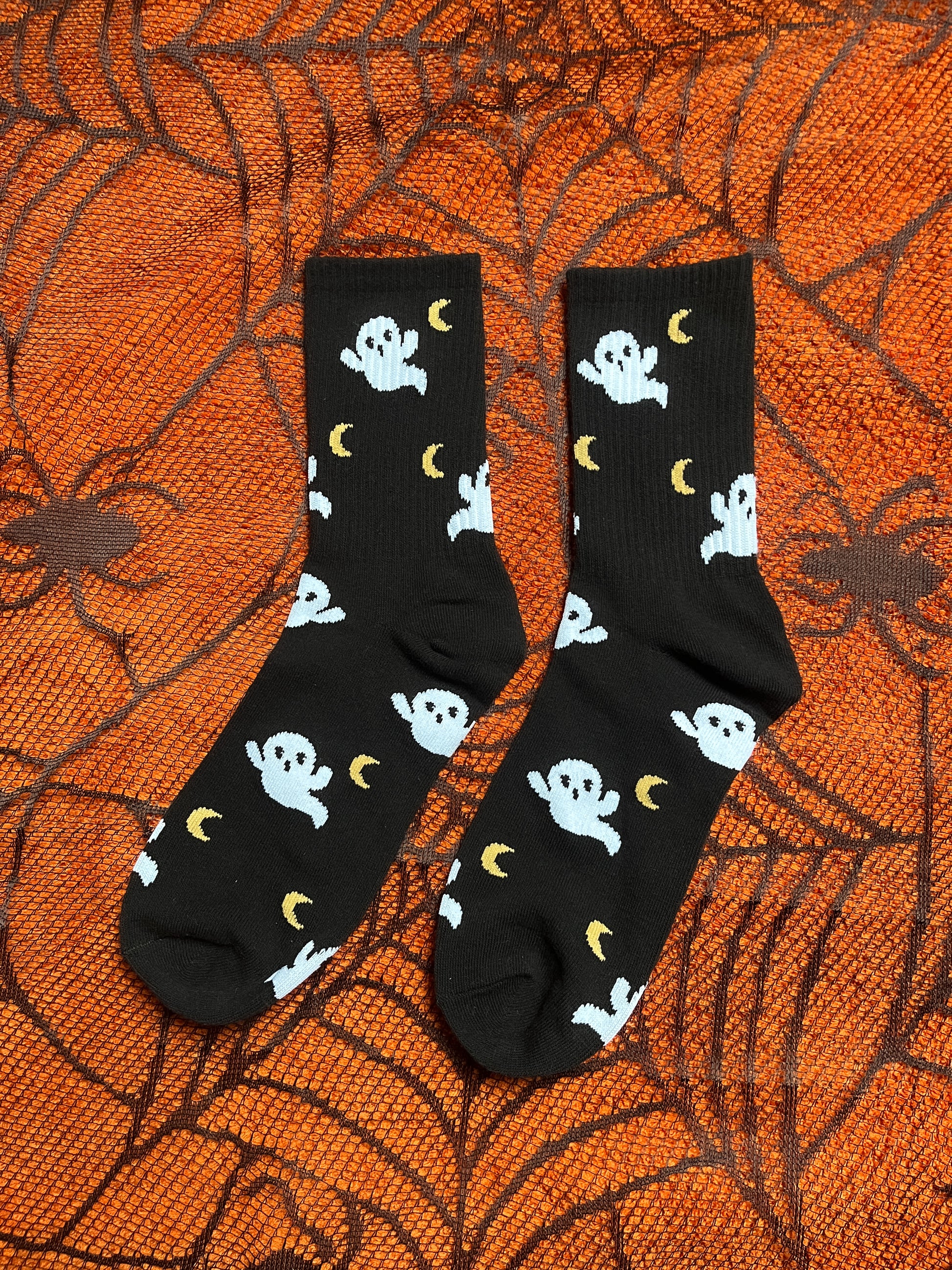 Black socks with ghost design made with cotton and spandex.