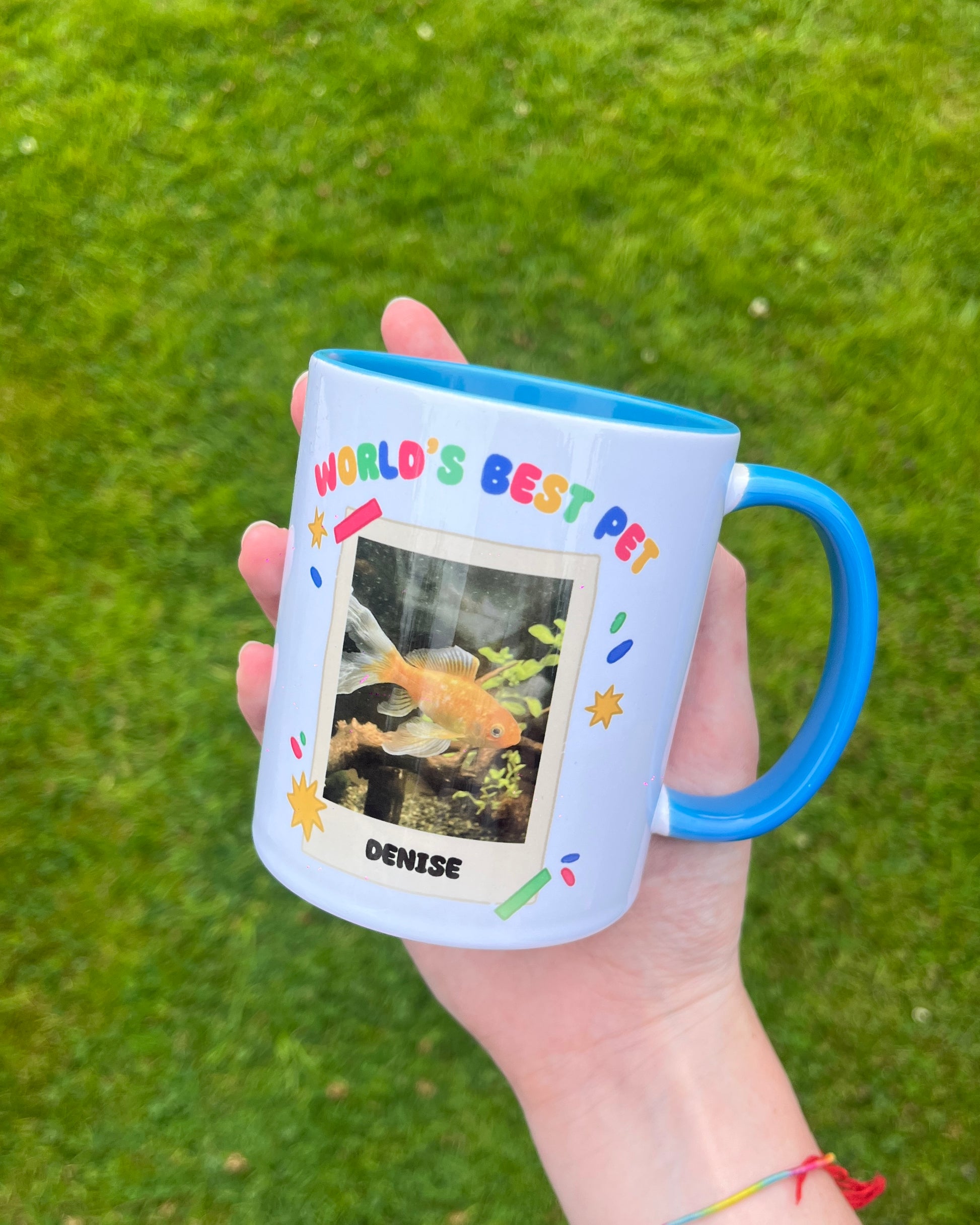 Custom ceramic hand printed mug with blue handle. Can be decorated with any slogan and image of choice. Pressed in Fruit Salad Apparel's home studio in Middlesbrough, UK.