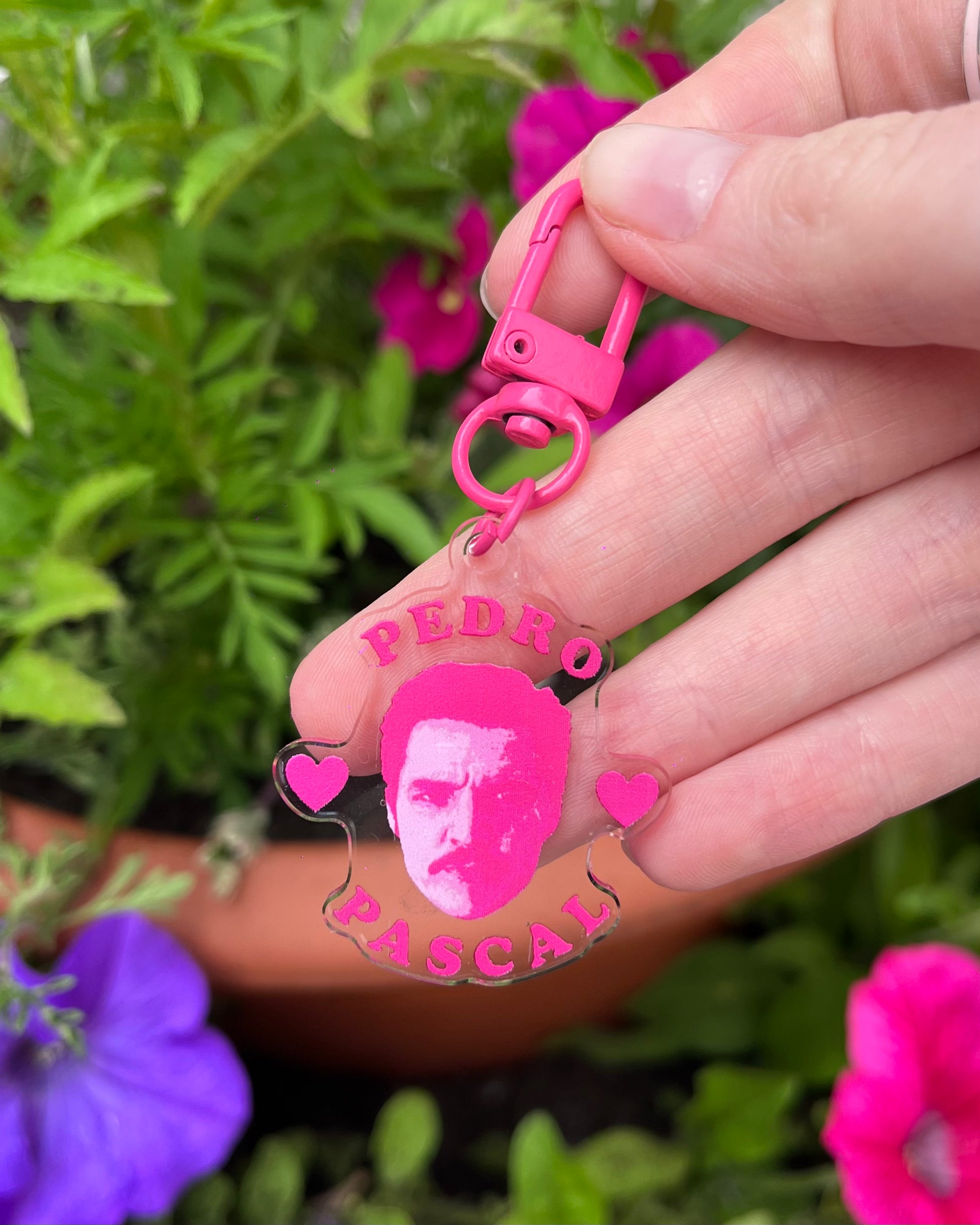 Pedro Pascal keyring finished with epoxy resin and a matching swivel clasp.
